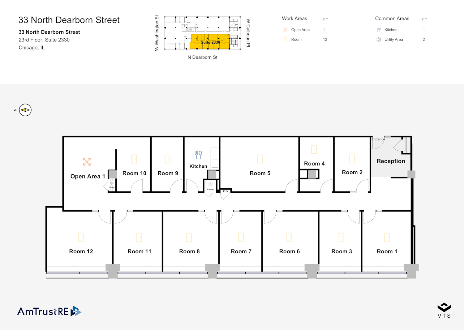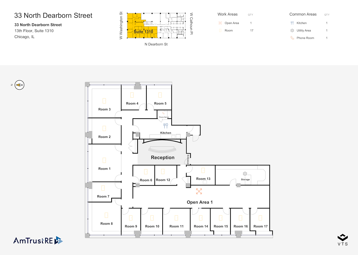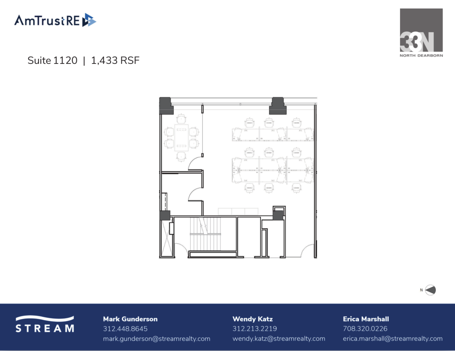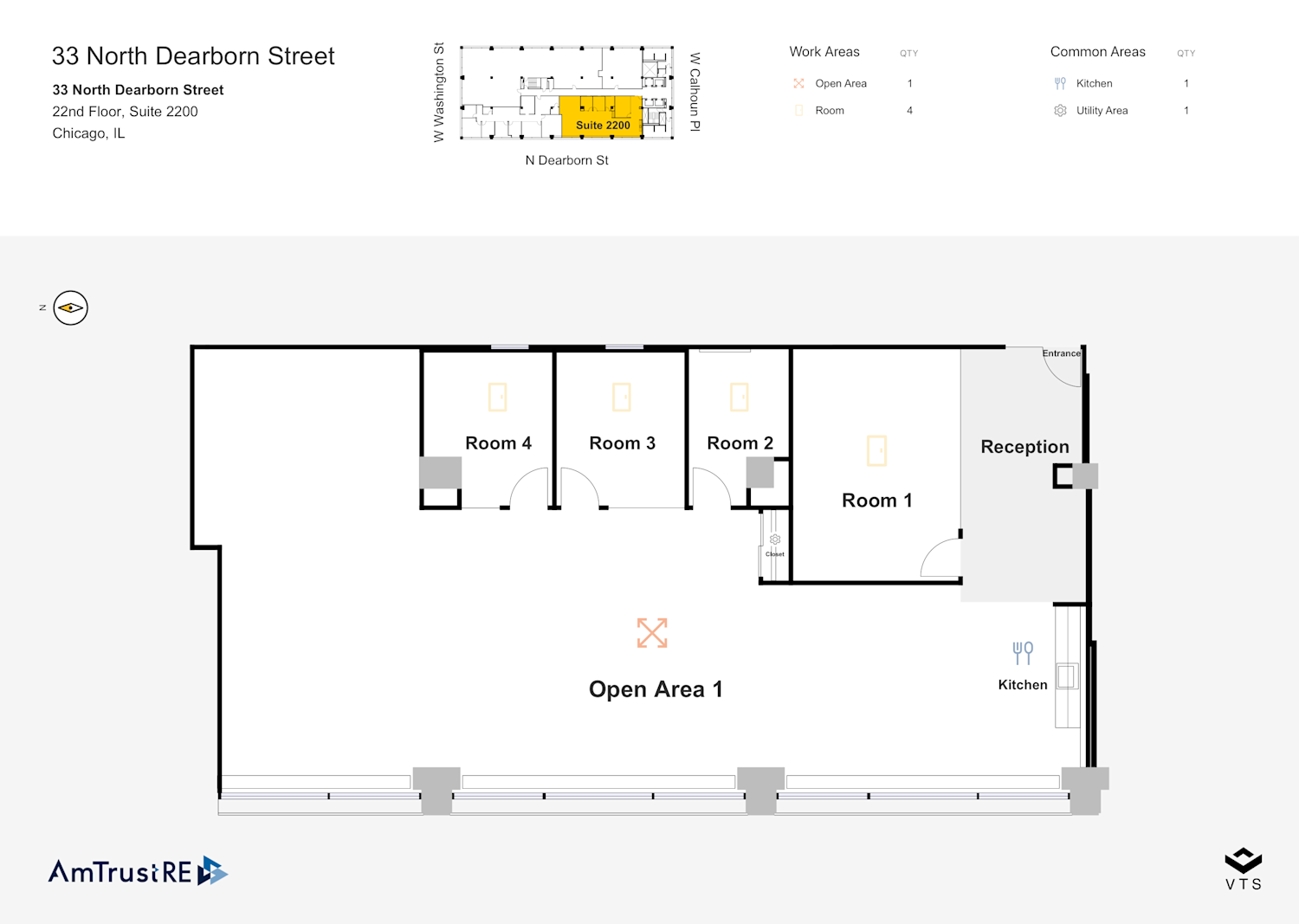 33 North Dearborn is among the only Class A boutique office buildings in Chicago’s Central Loop. Designed by revered architecture firm Skidmore, Owings & Merrill, 33 North Dearborn is a distinctive option for tenants across all industries. Tenants of 33 North Dearborn enjoy all the conveniences and amenities of a large office complex, within a smaller-scale environment. The building is centrally located within the functional necessities of downtown Chicago, such as a nearby L stop, the underground Pedway, the Daley Center, Block 37, and Millennium Park. With 13,000 square-foot floorplates and a side-loaded core, tenants achieve maximum identity and floor presence. The building also offers a full breadth of new amenities including an outdoor terrace, lounge, library, training room, and board room.